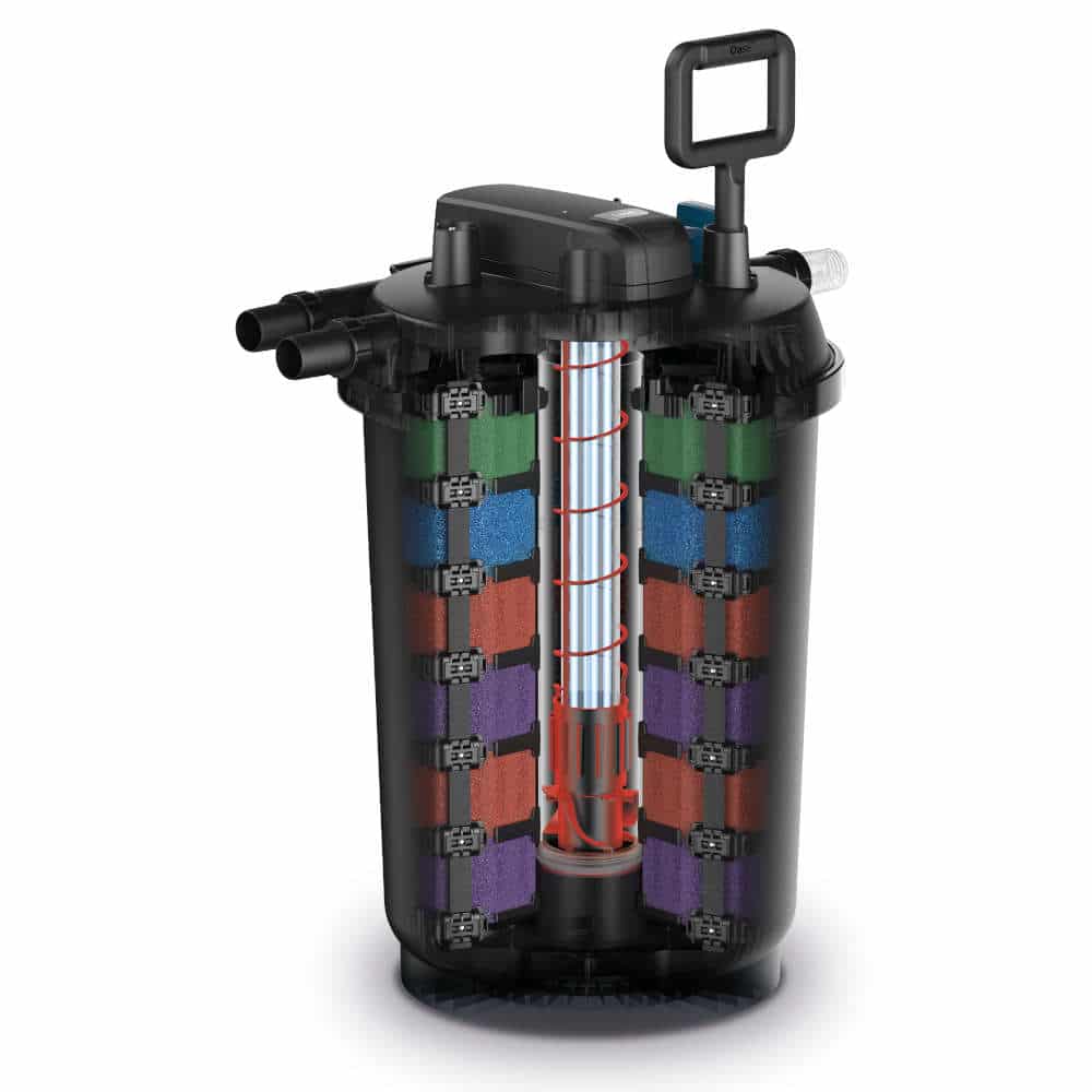 En extern pump (ingår ej) pressar vattnet genom filtermaterialet som består av flera skumgummisvampar med olika porer. I de fina svamparna trivs bakterier som kräver lite syre och bryter ned nitrater som bildas till vanlig kvävgas. Detta motverkar alger som behöver nitrat som näring. I de grova svamparna trivs de mer syrekrävande bakterierna som bryter ned giftigt nitrat som annars är farligt för fiskarna. Vattnet går sen tillbaka till dammen via utloppet.