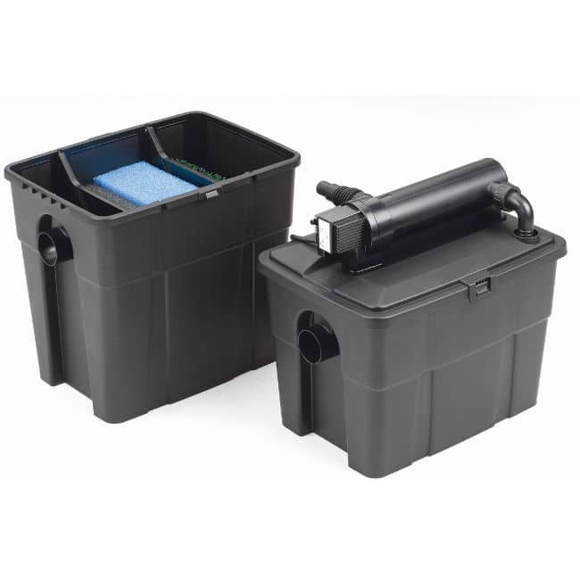 I paketet ingår pump PondoVario 1500 11 W, Flödesfilter MultiClear 5000 med inbyggt 7 W UVC och 3 m ¾” spiralslang. Tryckhöjden från vattenytan till utloppets placering bör inte överstiga 100 cm.