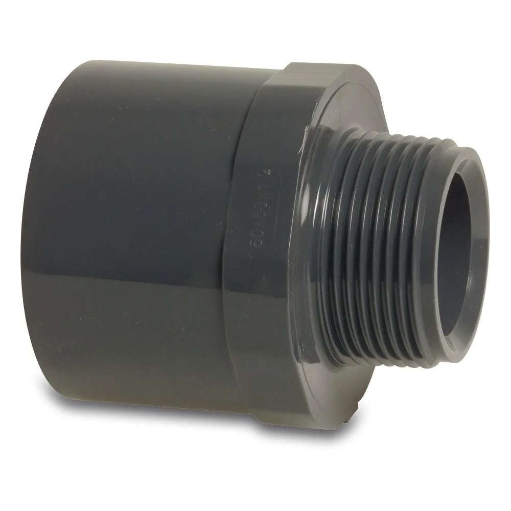 Övergång mellan 40/50 mm rör och 1½” utvändig gänga. Rördelen limmas med PVC-lim.