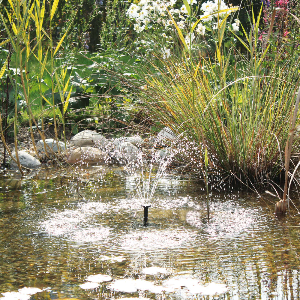 Fontänpump som drivs av solceller. Fyra olika munstycken ingår. PondoSolar 150 drivs av en solpanel på 1,4 W.