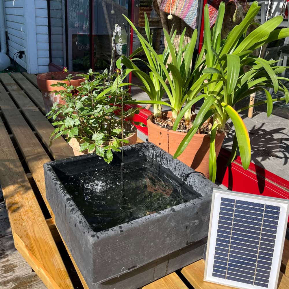 Denna solcellspump är ett enkelt och miljövänligt sätt att få cirkulation i den lilla dammen/vattenkärlet. Passar utmärkt att placera där tillgång till elektricitet ej finns.